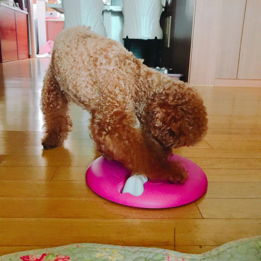 안에 피자형태로 칸이 나눠져 있어요. 그 안에 간식을 넣고 뚜껑을 닫으면 ~강아지가 저 흰색을 뽑은 뒤, 냄새를 맡아 판을 돌려가면서 간식을 찾아 먹는거예용~