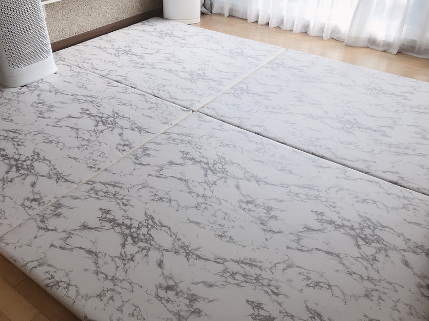 아이가 생기면 알록달록해 지는 집..이제 컬러매트말고 마블무늬 매트를 깔아보자. 뒷면은 크림색으로 양면으로 사용가능하고 사이즈를 맞춤으로도 제작할 수 있다.